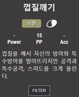 그리고 '먹보' 패시브로 나무열매를 체력이 절반일때 먹어버리는 특징이 있어 각종 나무열매와 열매주머니, 먹다남은음식, 조개껍질방울 등 체력회복 아이템을 얻어놓았다면 고스트타입과 어울리는 좀비같은 모습으로 악착같이 버티는 모습을 볼 수 있습니다.
