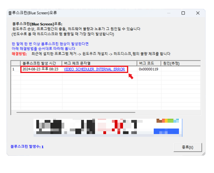 위의 그림에서와 같이 블루스크린 현상이 발생했다면 고클린 프로그램에서 원인이 무엇인지 확인해볼 수 있습니다.