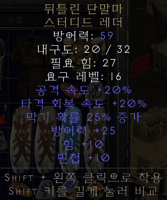 | 공격 속도 +20% 타격 회복 속도 +20% 막기 확률 25% 증가 방어력 +25 힘 +10 민첩 +10 |