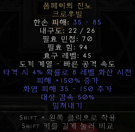 | 한손 피해 : (33-37) ~ (81-91) 내구도 : 26 필요 민첩 : 70 필요 힘 : 94 아이템 레벨 : 53 요구 레벨 : 45 |