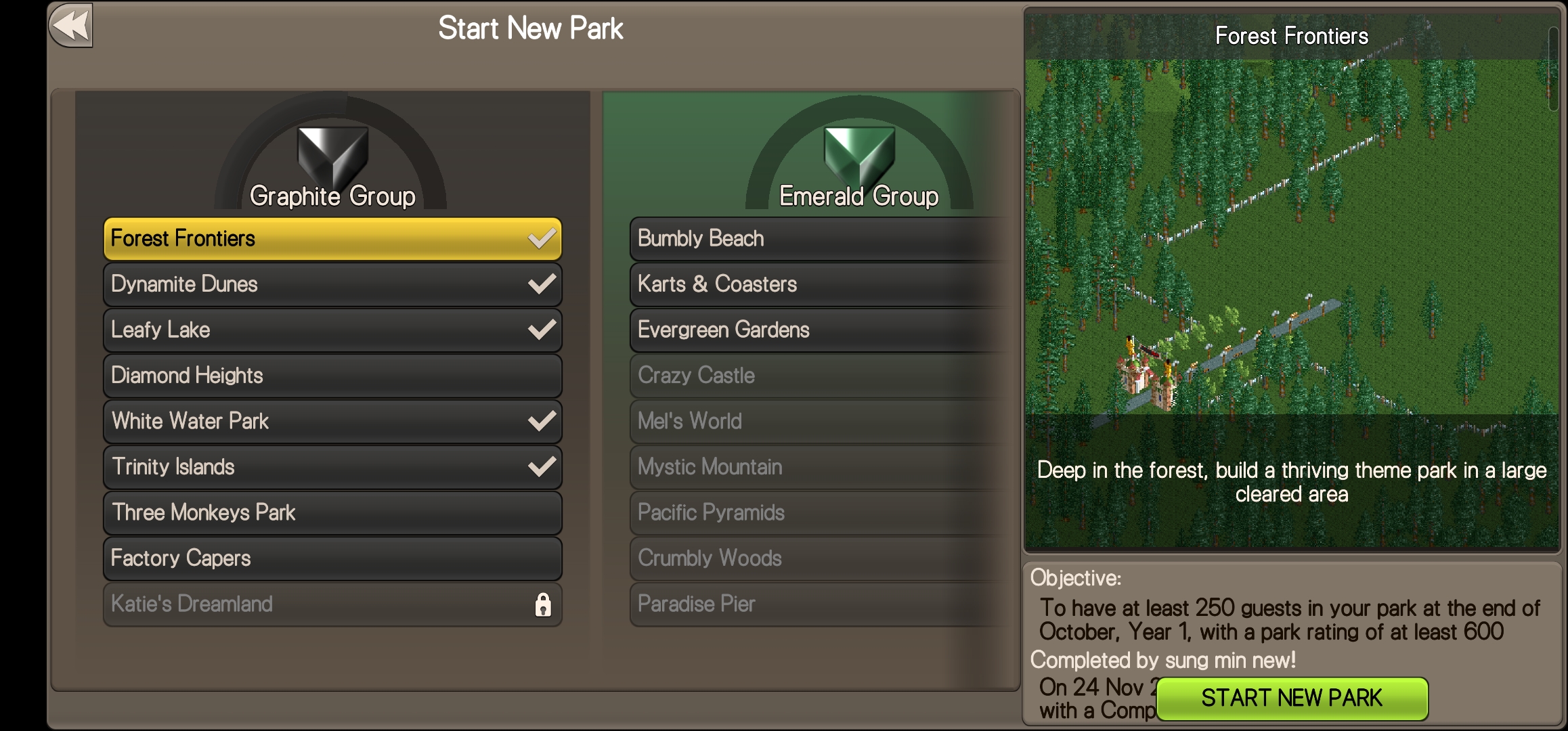 게임에는 다양한 미션과 시나리오가 포함되어 있어 플레이어는 다양한 도전에 직면하게 됩니다. 새로운 테마파크를 성공적으로 운영하는 것 외에도 특정 목표를 달성해야 퀘스트를 클리어 할 수 있습니다.
